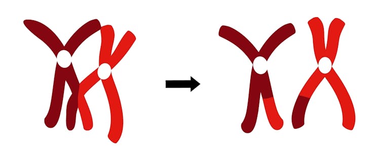 La recombinaison, également connue sous le nom de crossing-over, est l’autre principale façon avec laquelle l’ADN accumule les changements dans le temps. Il conduit à un brassage des deux copies du génome (une de chaque parent), qui sont regroupées en chromosomes. Au cours de la recombinaison, les chromosomes correspondants (homologues) s’alignent et échangent des segments, de sorte que le génome que vous transmettez à vos enfants est une mosaïque de l’ADN de vos parents.